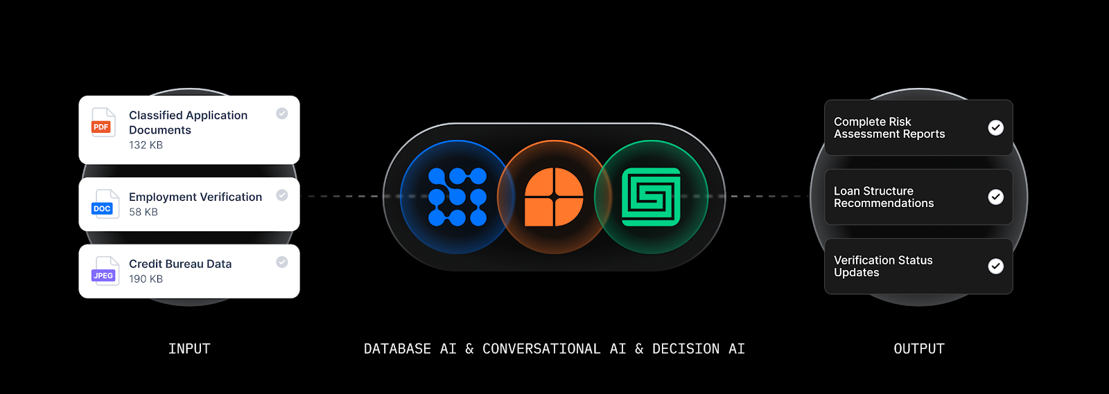 Conversational AI automates applicant outreach for employment verification. Database AI connects to internal and third-party data sources in real time. Decision AI flags inconsistencies, performs risk assessments, and helps structure terms based on borrower profile and market conditions.