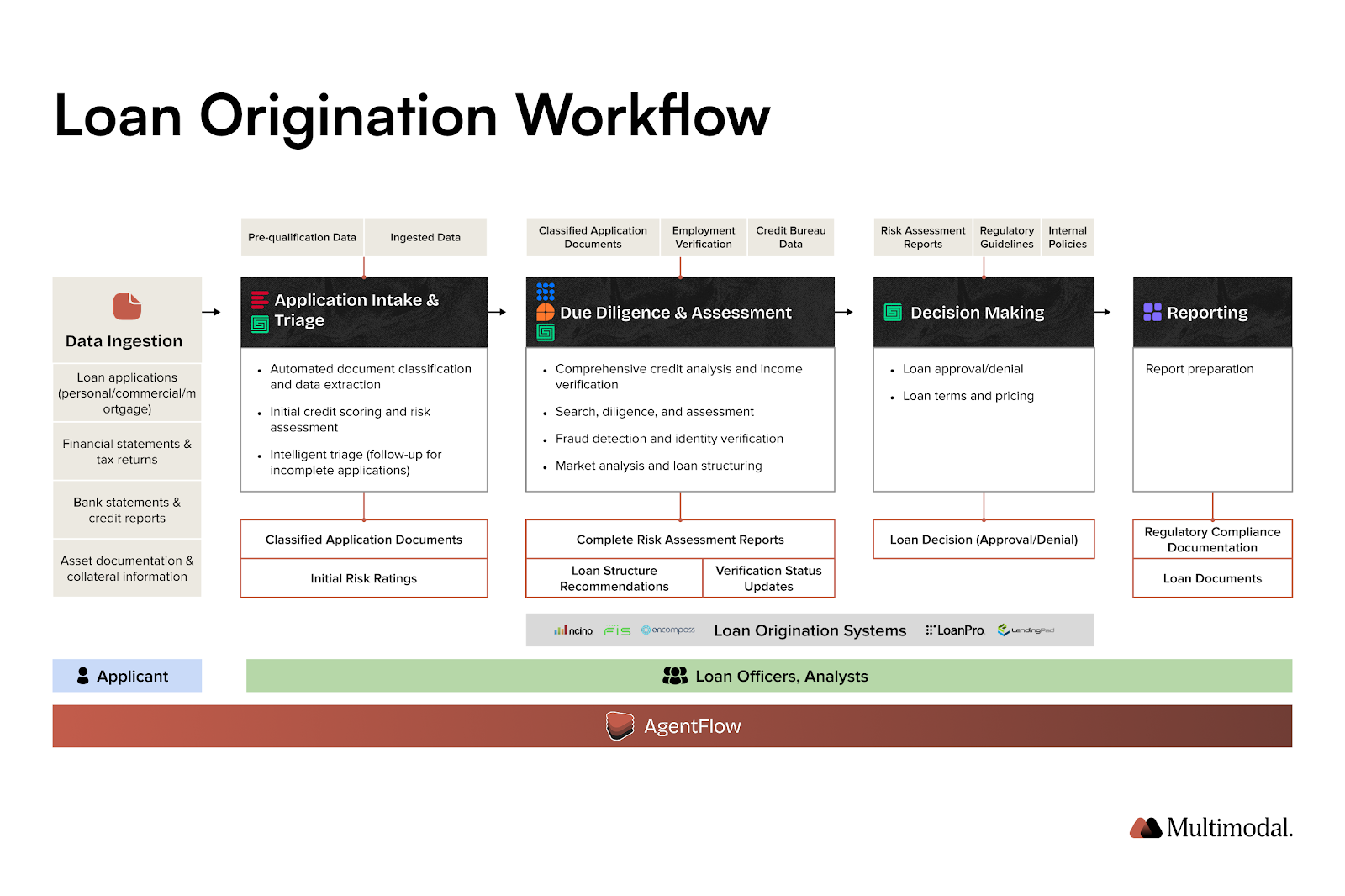 AgentFlow is Multimodal’s agentic AI platform. It brings together specialized AI agents—like Document AI, Decision AI, Conversational AI, and Report AI—to automate regulated workflows across finance and lending.