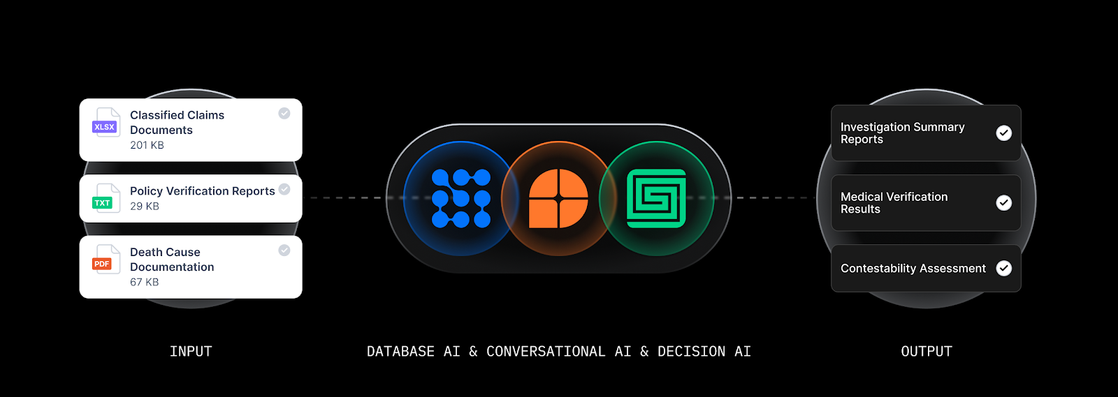 Conversational AI retrieves and summarizes medical records. Database AI connects to internal and external systems for historical payment data. Decision AI runs checks against contestability criteria and eligibility rules.