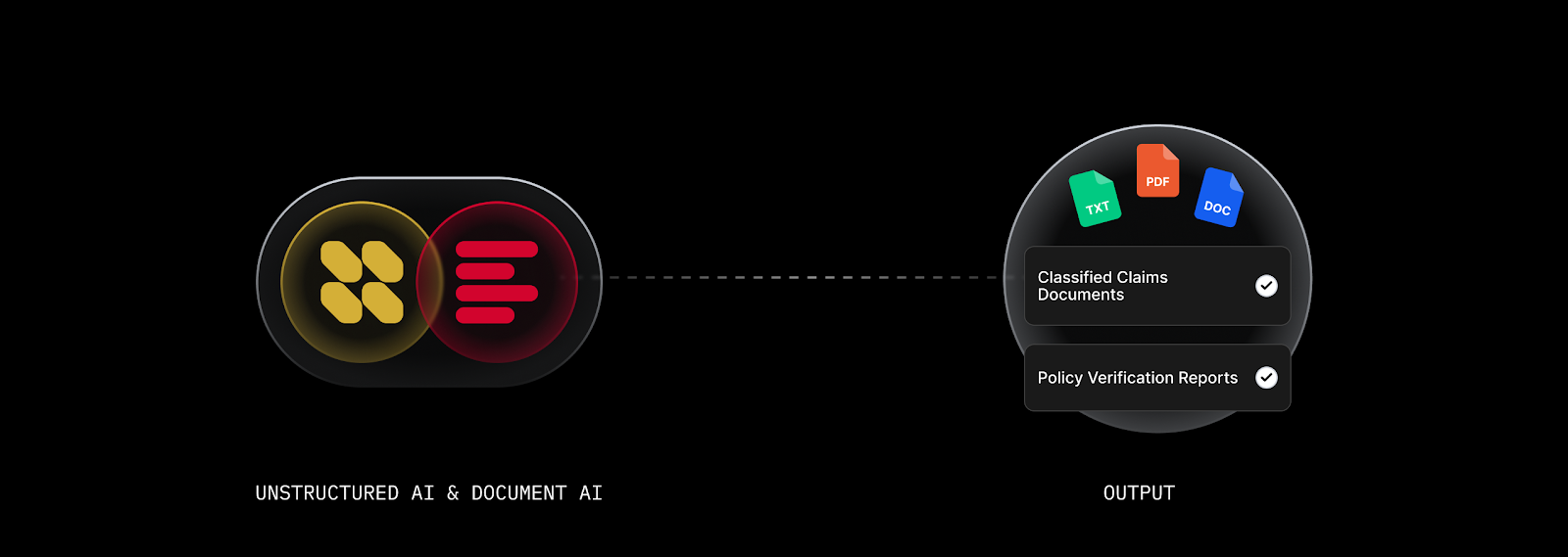 Document AI classifies documents automatically. Decision AI validates policy coverage against internal rules, while Unstructured AI extracts and verifies beneficiary contact details from messy, scanned documents.
