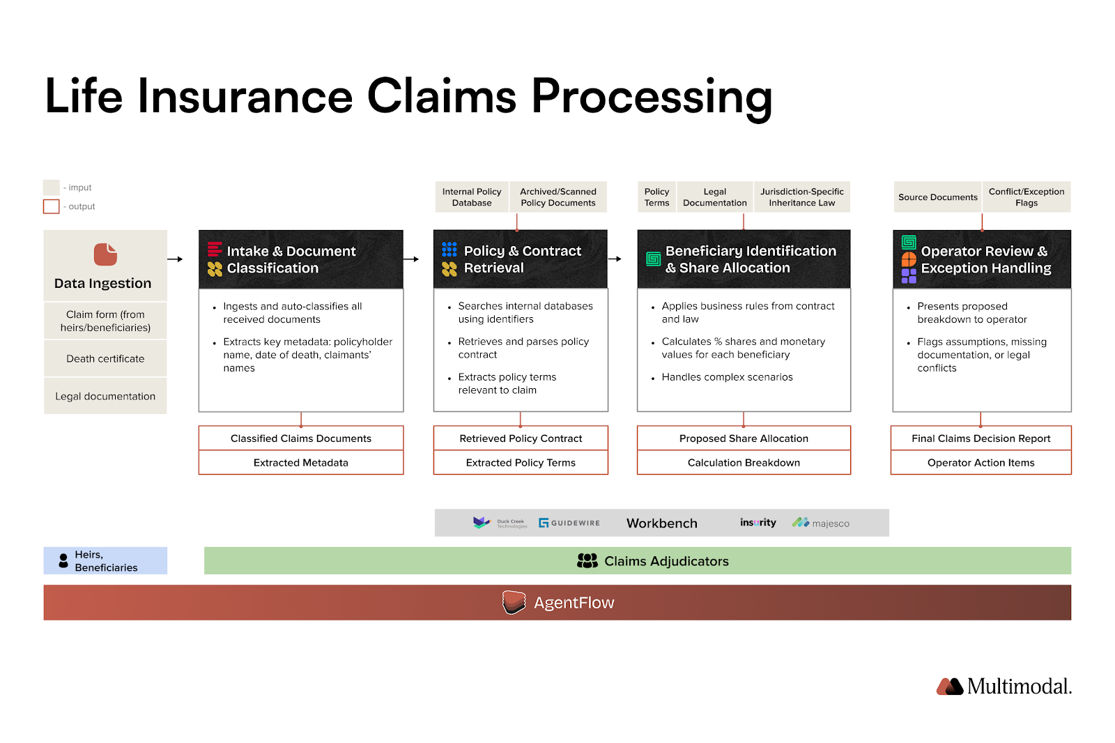AgentFlow is Multimodal’s AI platform for automating complex workflows. In insurance claims processing, it handles tasks like document review, eligibility checks, and reporting, quickly and securely.