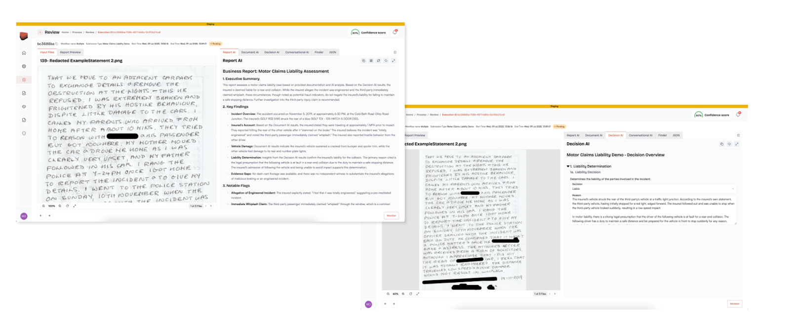 Document AI extracts and structures key information from diverse evidence sources, while Decision AI applies company rules, prior adjudications, and regulatory guidelines to deliver consistent, explainable outcomes.