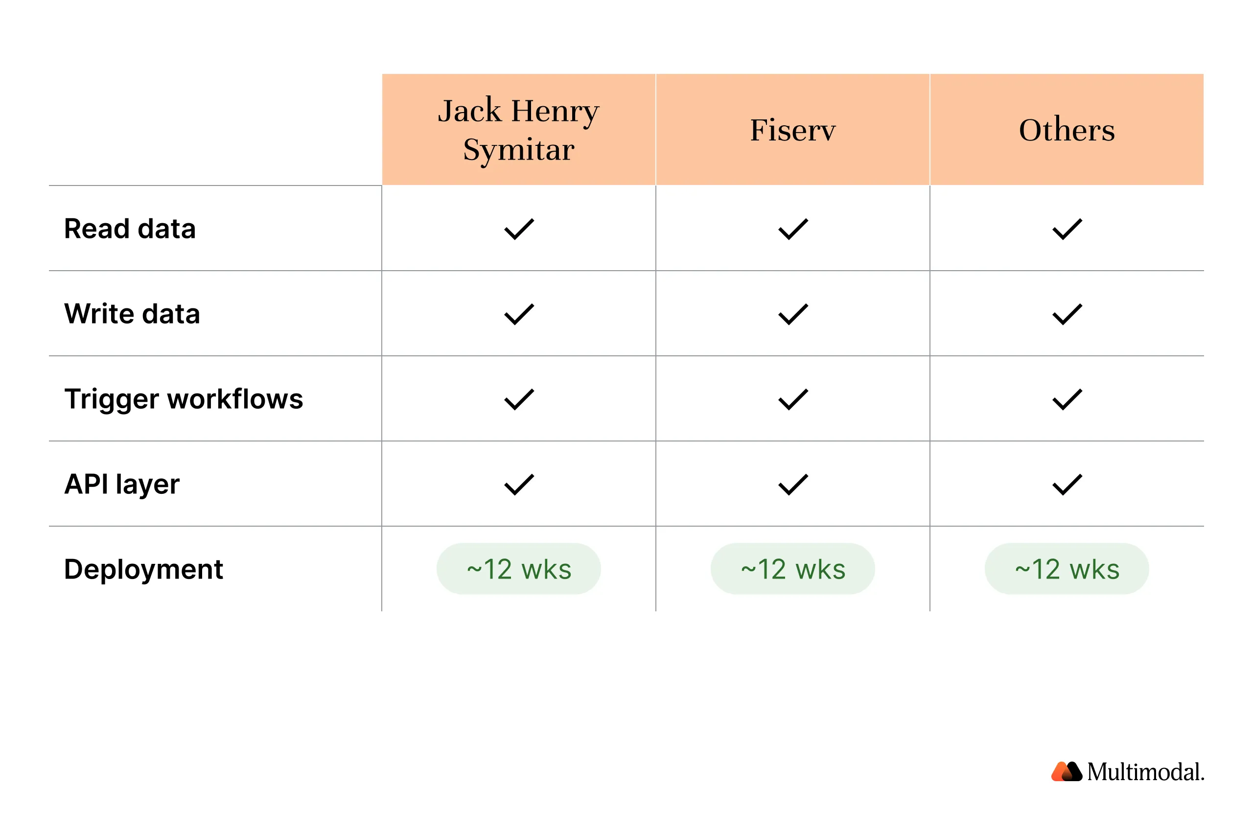 While Fiserv integrations are not yet in production, the capability exists, and financial institutions on Fiserv can engage Multimodal to scope a pilot. The objective is the same as on Jack Henry: a fully integrated data pipeline between AgentFlow and the banking systems the institution already runs, without adding complexity to the existing tech stack.