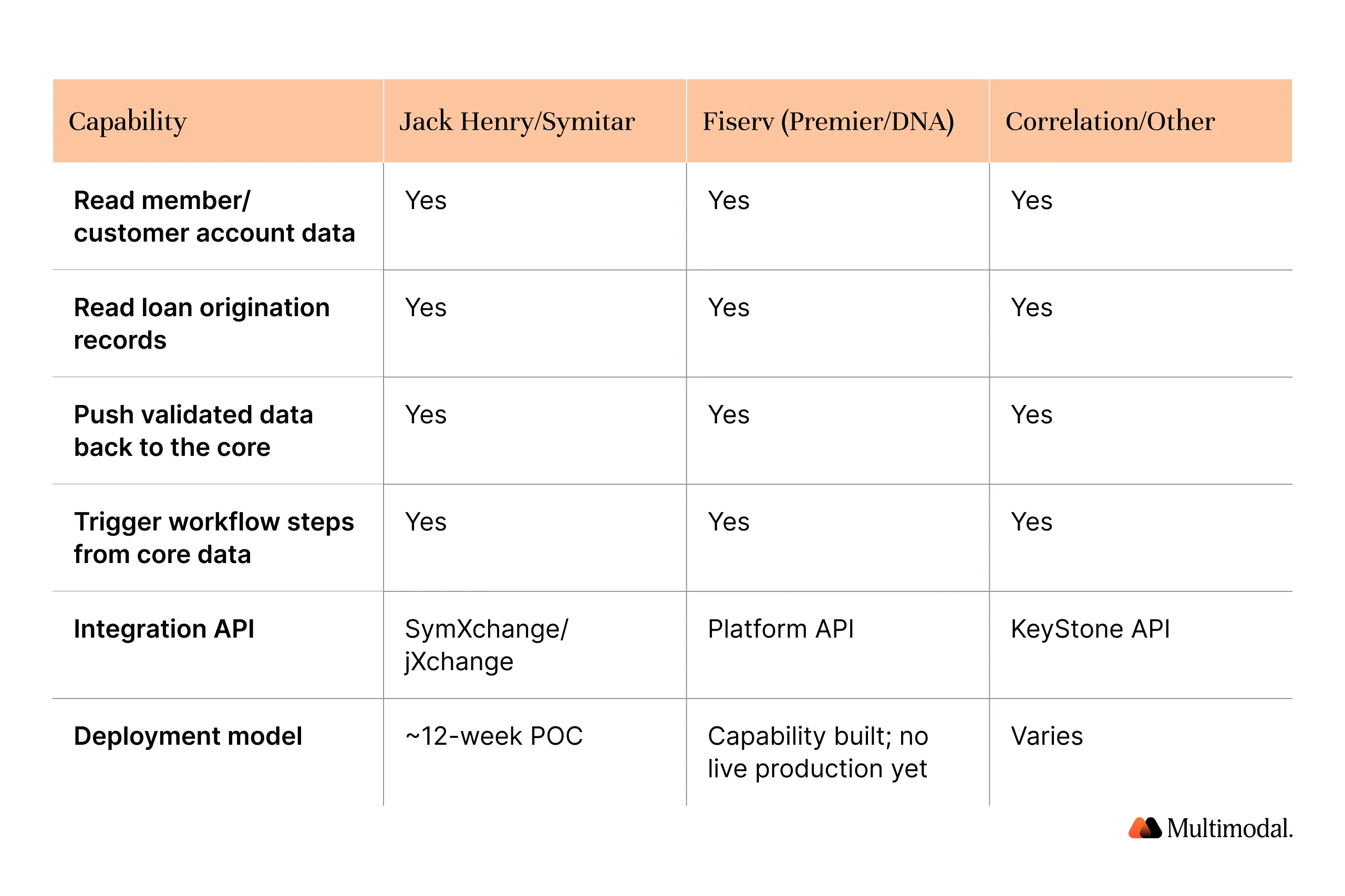 Fiserv serves 42% of banks and 31% of credit unions surveyed. Jack Henry serves 21% of banks and 12% of credit unions. For financial institutions on these core banking platforms, the integration question is not theoretical. It is the difference between an AI solution that reaches production and one that stalls in a proof of concept indefinitely.