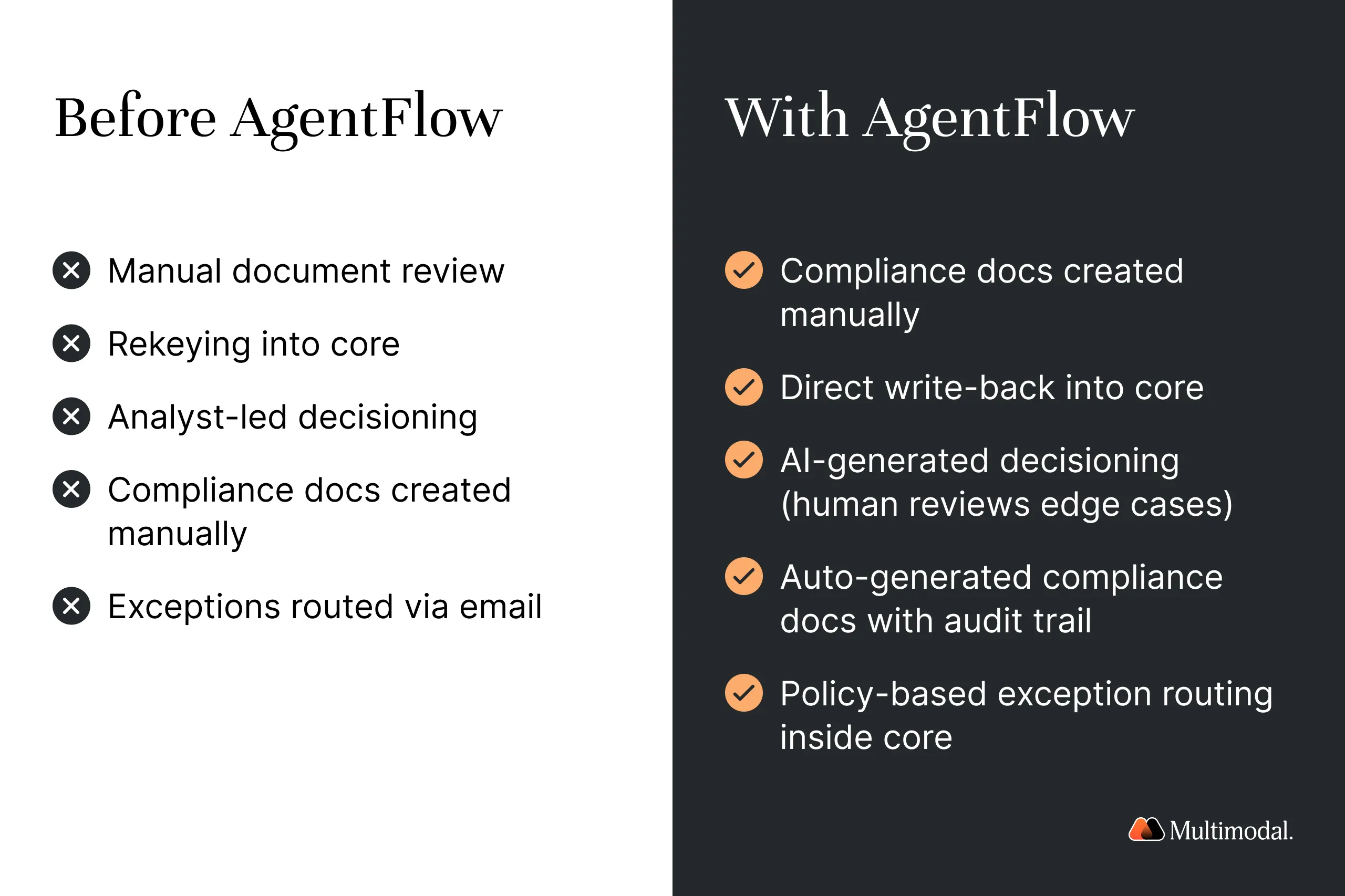 Applications outside standard parameters are typically routed through email, disconnected from the core. AgentFlow routes exceptions automatically based on document content and policy rules, logged within the core workflow. The exception queue is visible, auditable, and no longer dependent on someone's inbox.