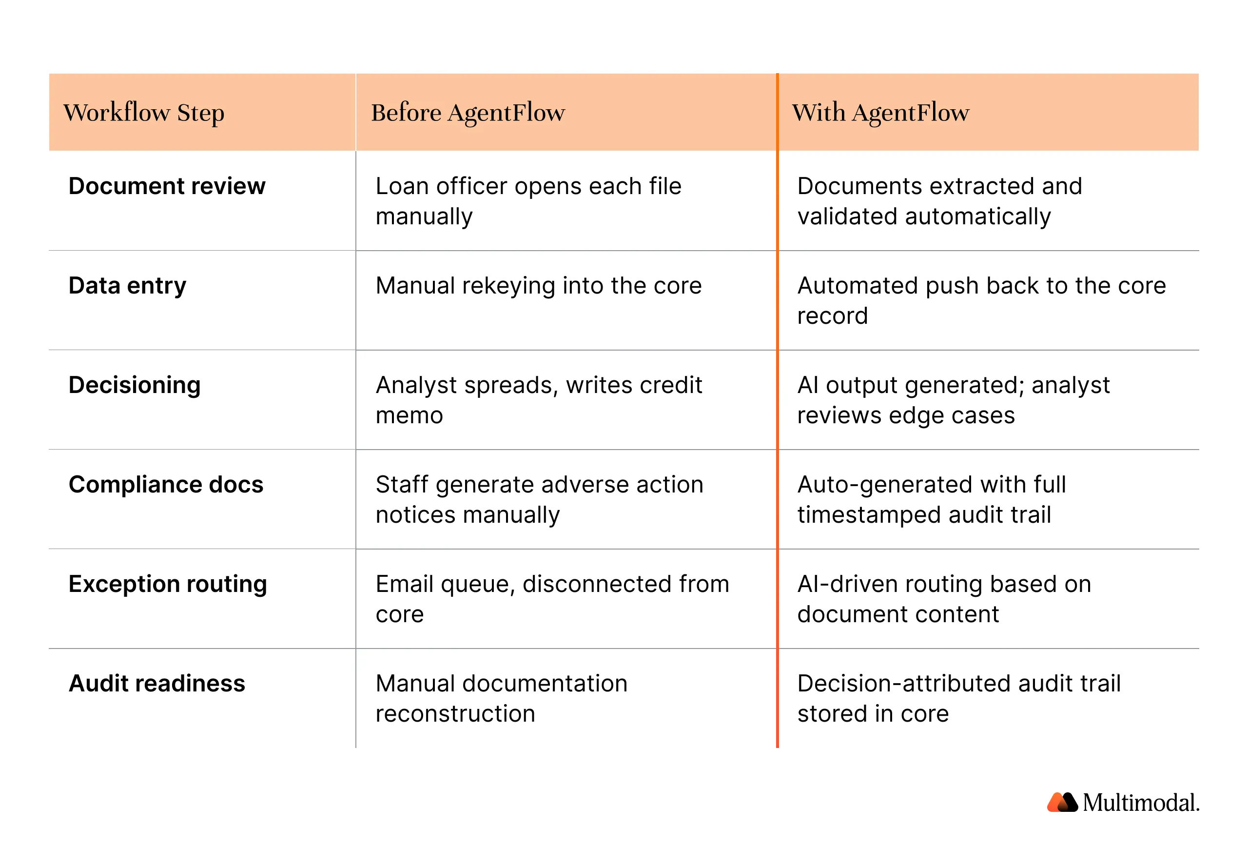 Documents submitted by borrowers are stored in the loan file. Without AI, a loan officer opens each one and manually enters the relevant data into the core. With AgentFlow connected, documents are ingested, classified, extracted, and validated automatically. Discrepancies are flagged for review. Clean applications move forward without a human opening a file.