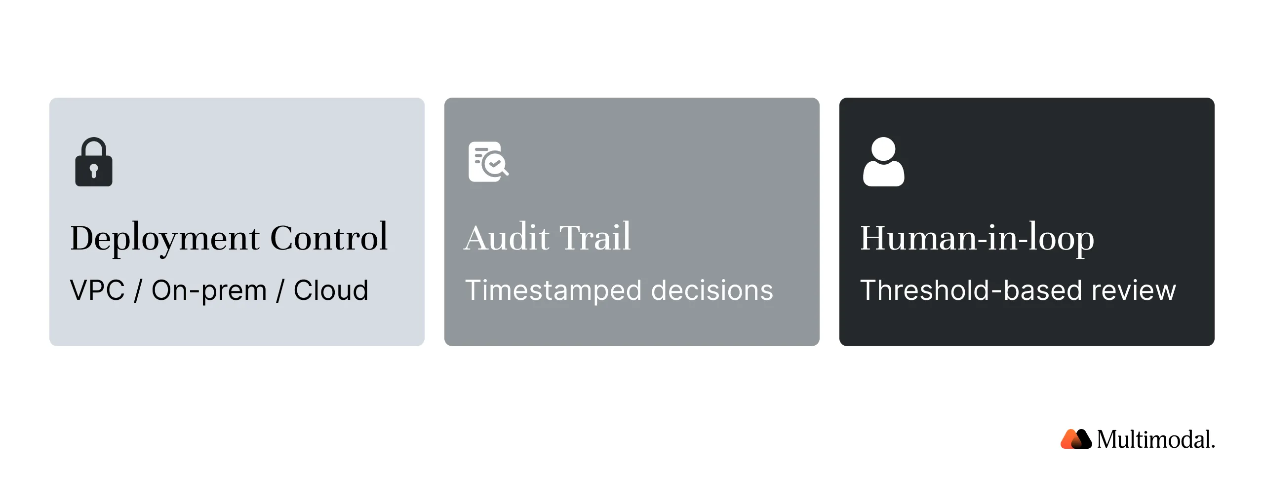 Multimodal's standard engagement is a ~12-week POC covering three workflows. Forward-deployed engineers handle configuration, calibration, and iterative testing rounds. The calibration process is how institutions build confidence in AI decisions before full adoption. Timeline varies based on core platform, document types, and workflow complexity.