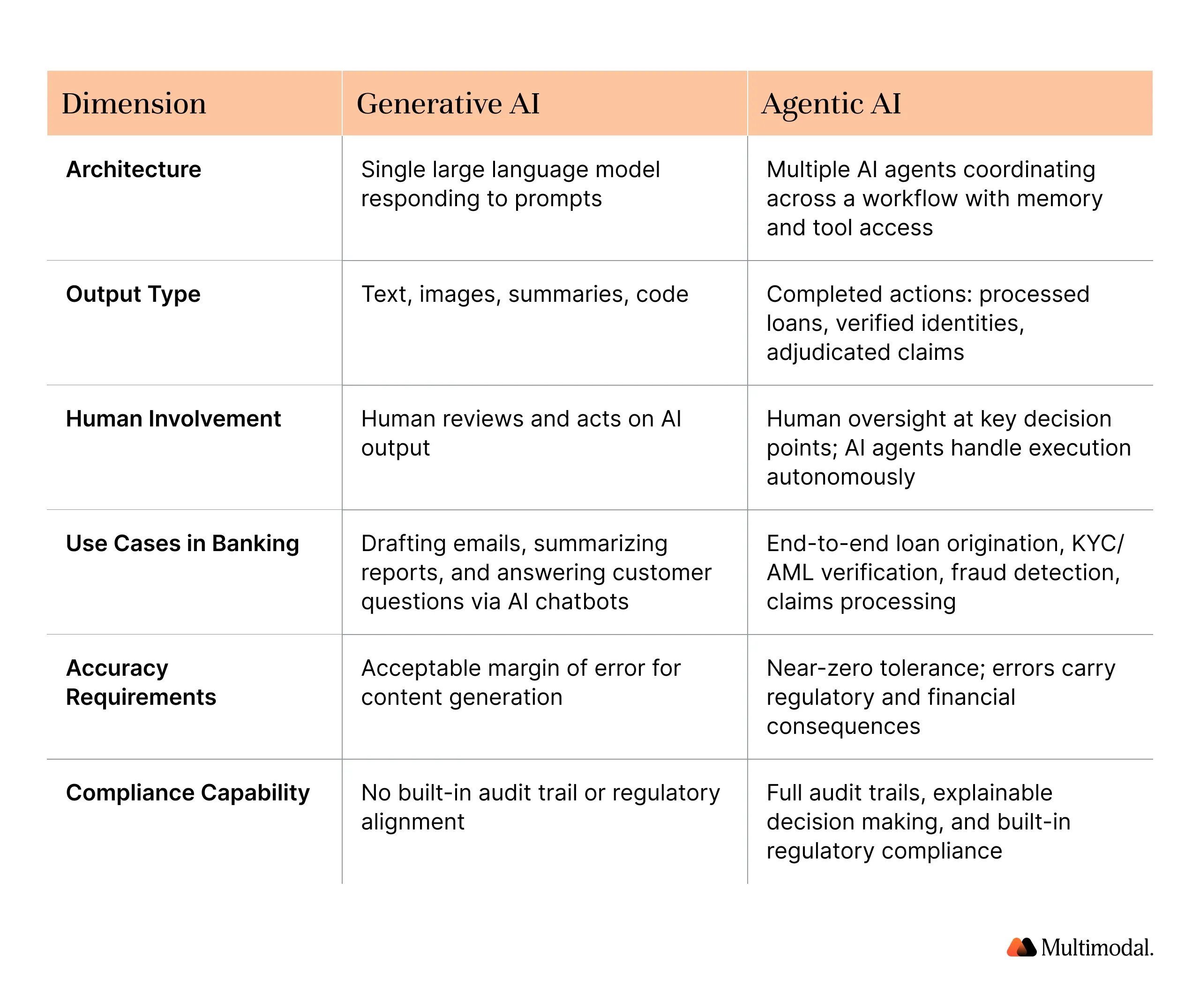 Generative AI creates content; agentic AI executes entire banking workflows.