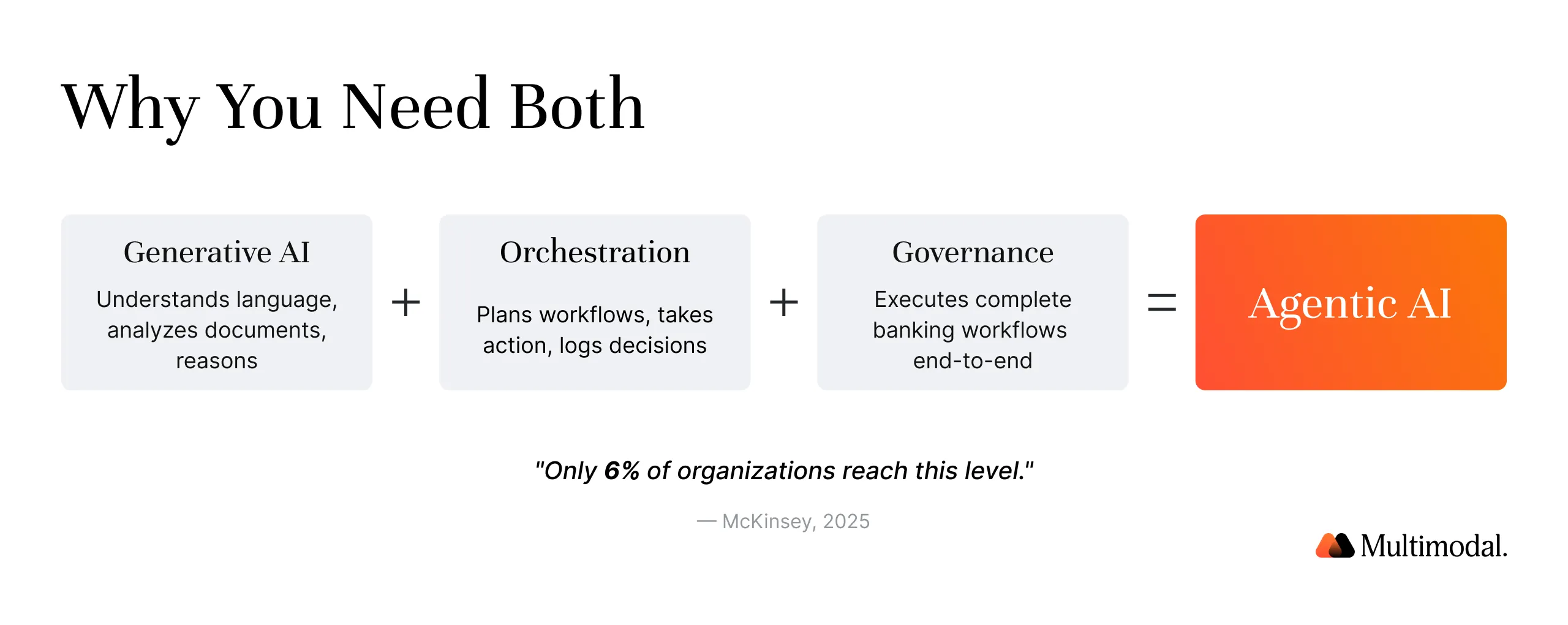 But for the workflows that define how financial institutions create value and maintain compliance, generative AI is a component, not a solution. The path forward is agentic AI with generative AI components under the hood. AI agents use large language models for natural language understanding, document analysis, and data analysis, while adding the orchestration, memory, tool integration, and governance layers that regulated industries require.