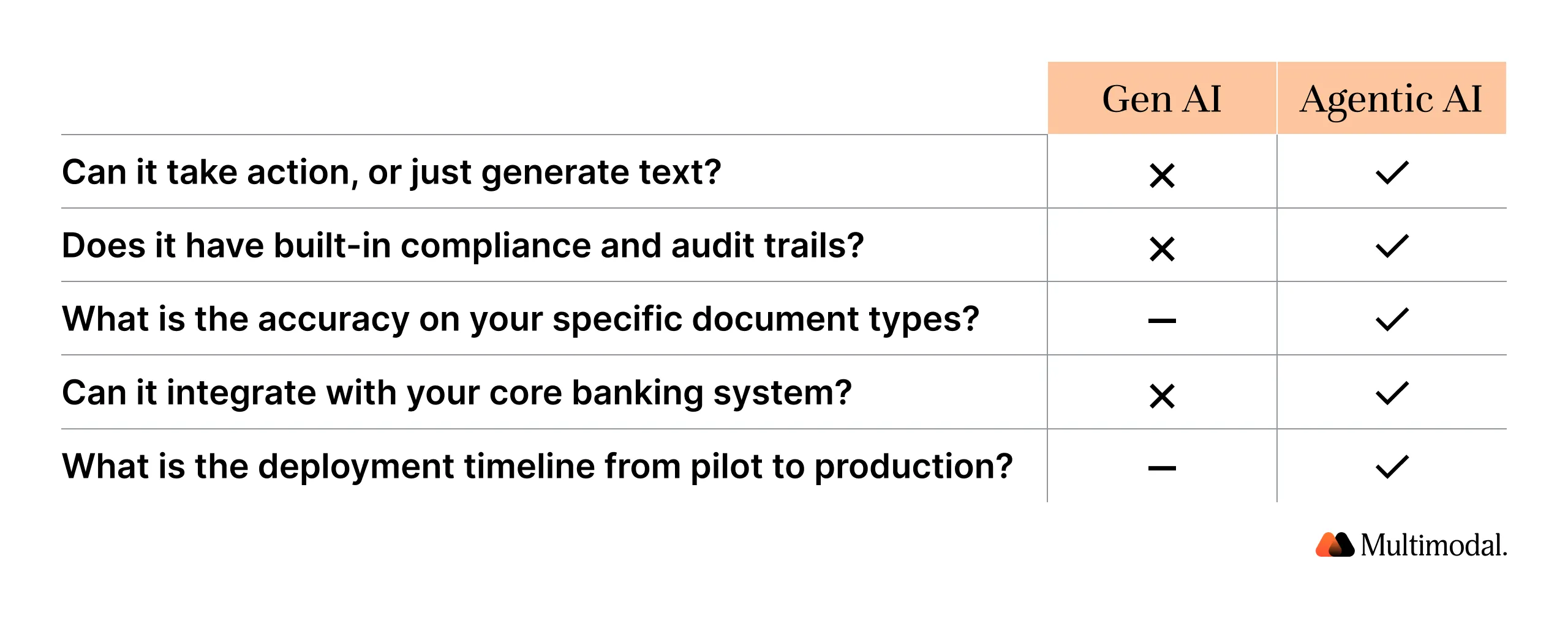 Agentic AI executes workflows. Generative AI creates content. Learn what financial institutions need, with use cases, a comparison table, and vendor evaluation questions.
