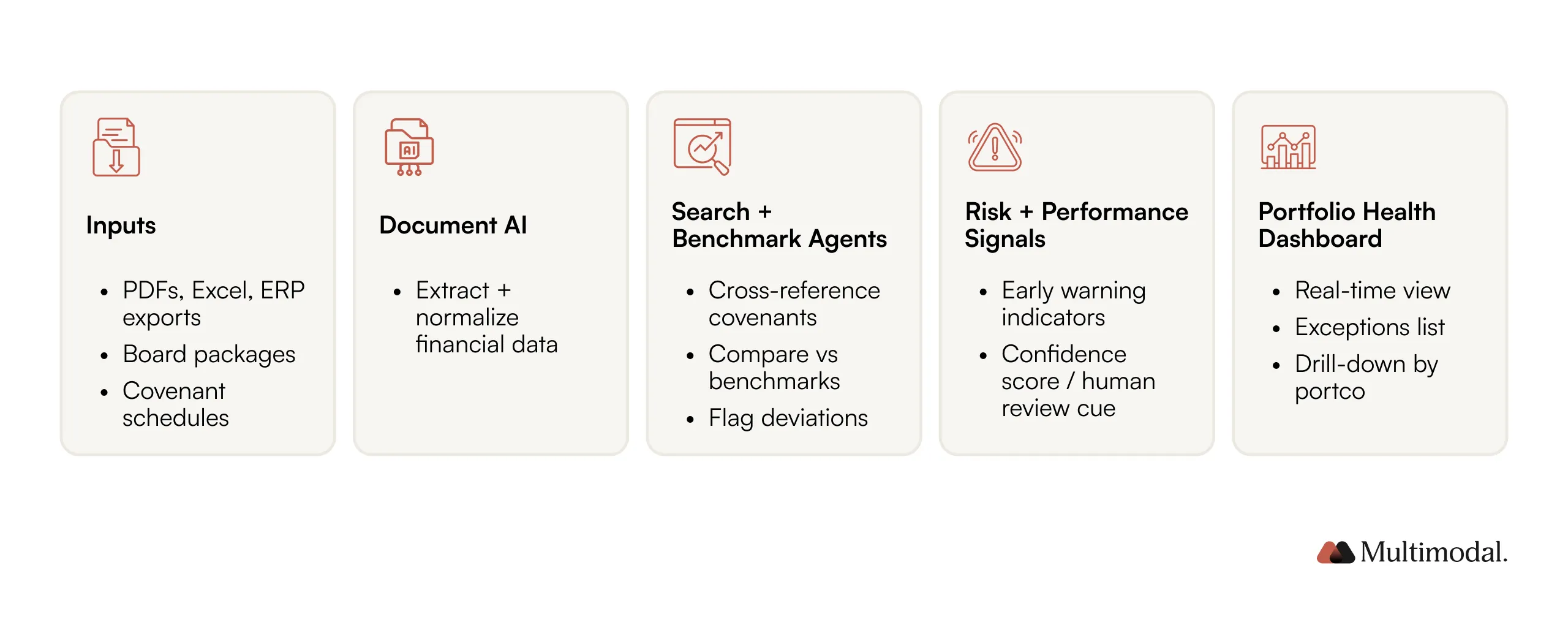 With a multi-agent platform like AgentFlow, an operating partner can configure a document processing agent to ingest quarterly financials from 40+ portfolio companies, regardless of format, while Search Agents cross-reference industry benchmarks and flag covenant breaches, delivering a unified health dashboard in hours.