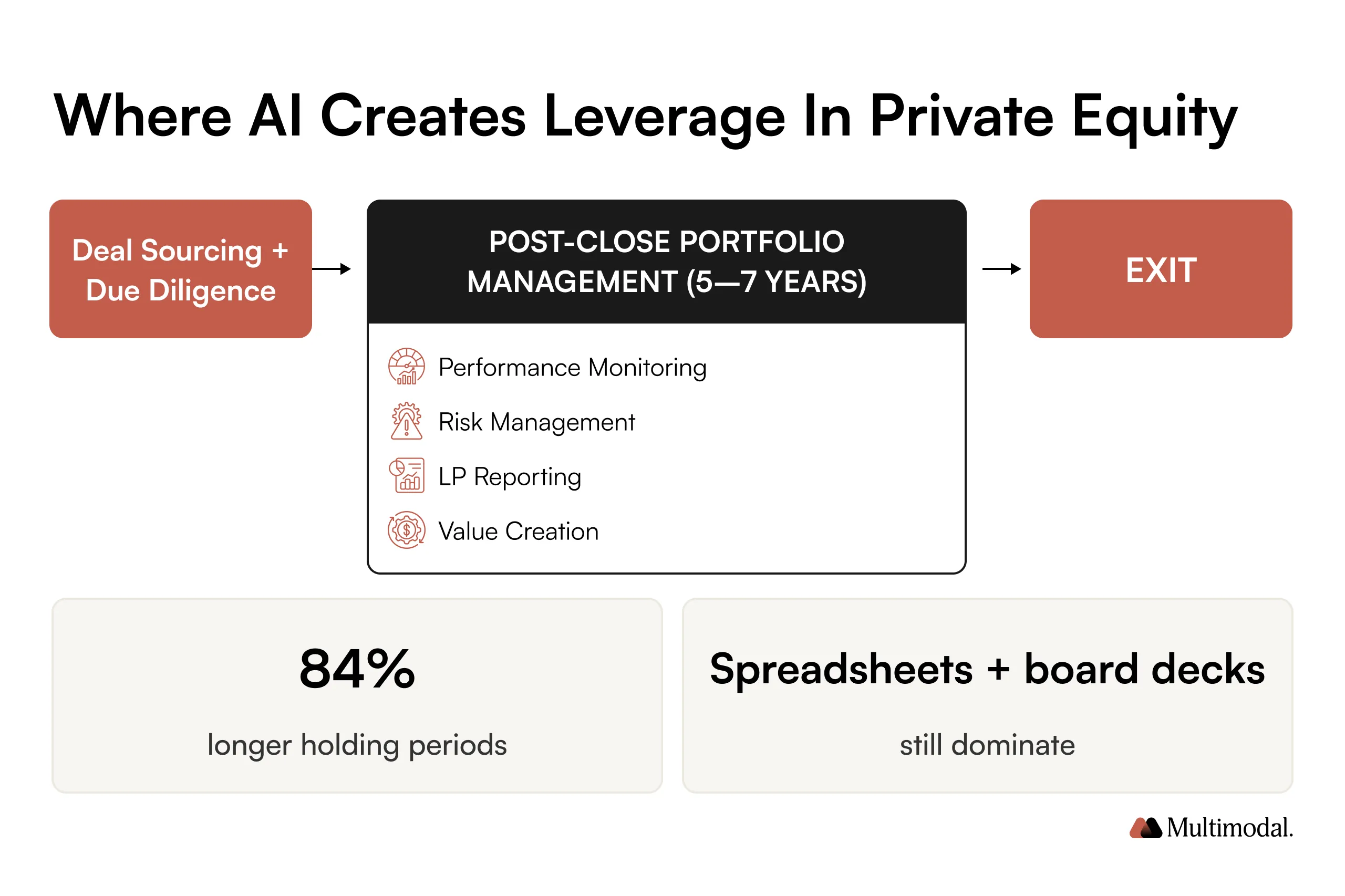 The timing behind this shift is showing up in the data. 84% of PE firms have appointed a Chief AI Officer. 84% of fund managers report longer holding periods, making portfolio monitoring more critical than ever. Longer holds and slower exits raise the cost of blind spots across investment portfolios.