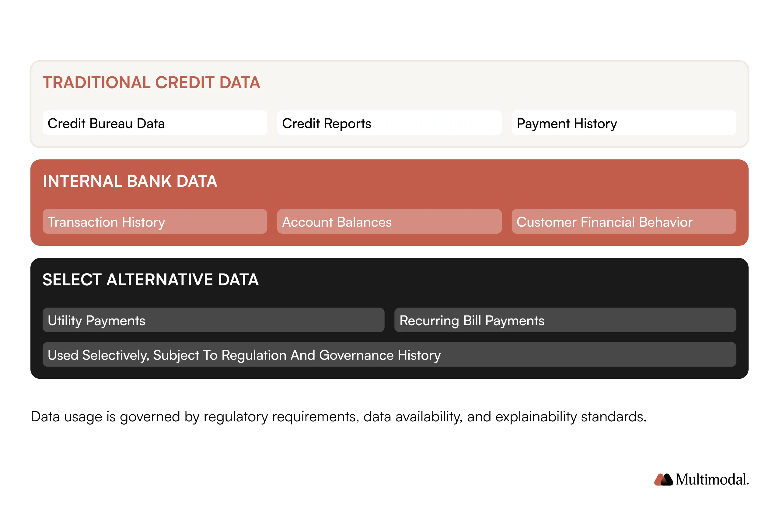 AI-powered credit scoring models rely on a combination of traditional and expanded data inputs. Core inputs still include bureau data, credit reports, payment history, and internal bank data related to financial history and account behavior. These remain central to most credit risk assessment frameworks.