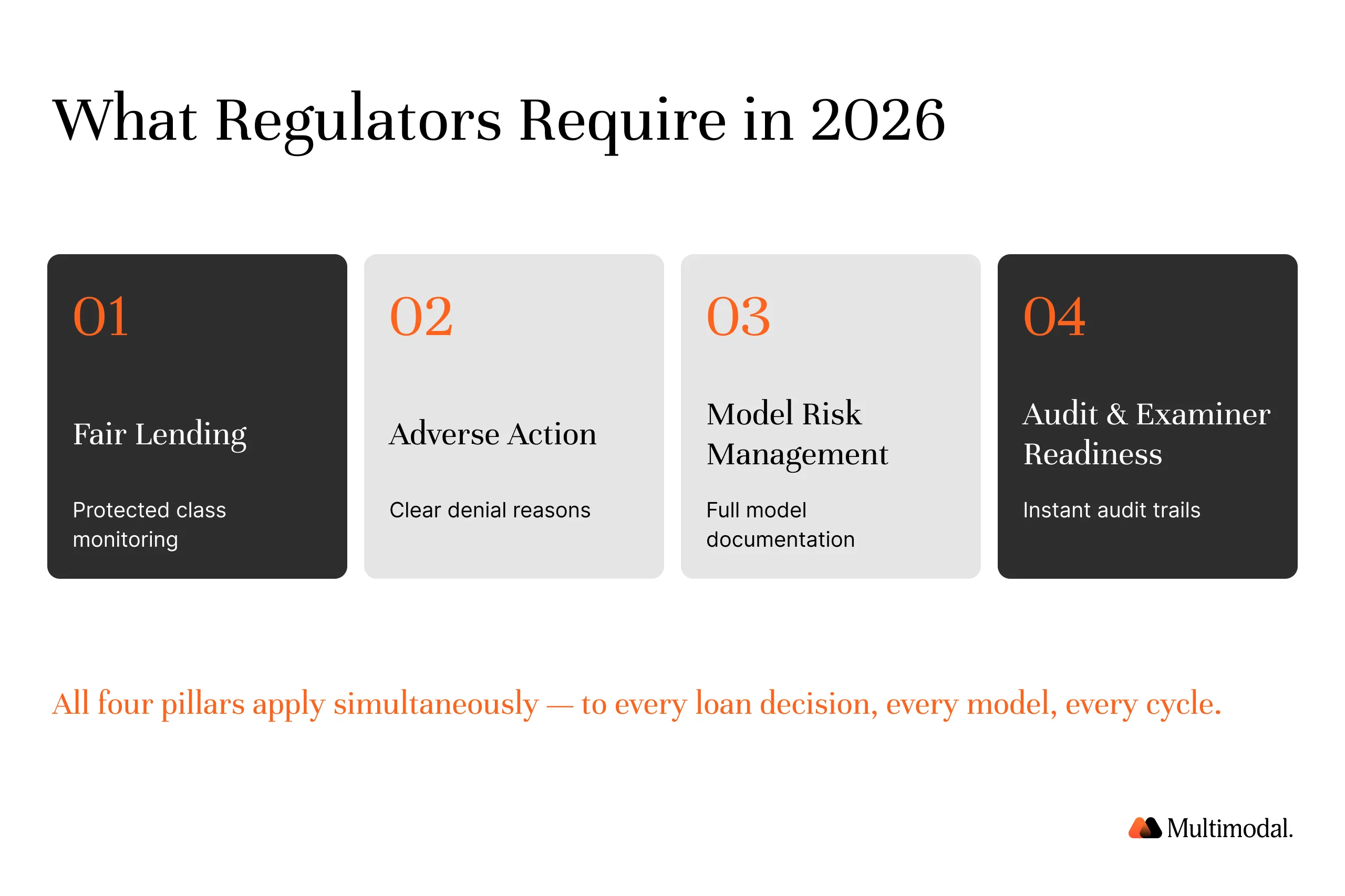 Compliance is a design input in 2026, covering fair lending, adverse action, and model risk.