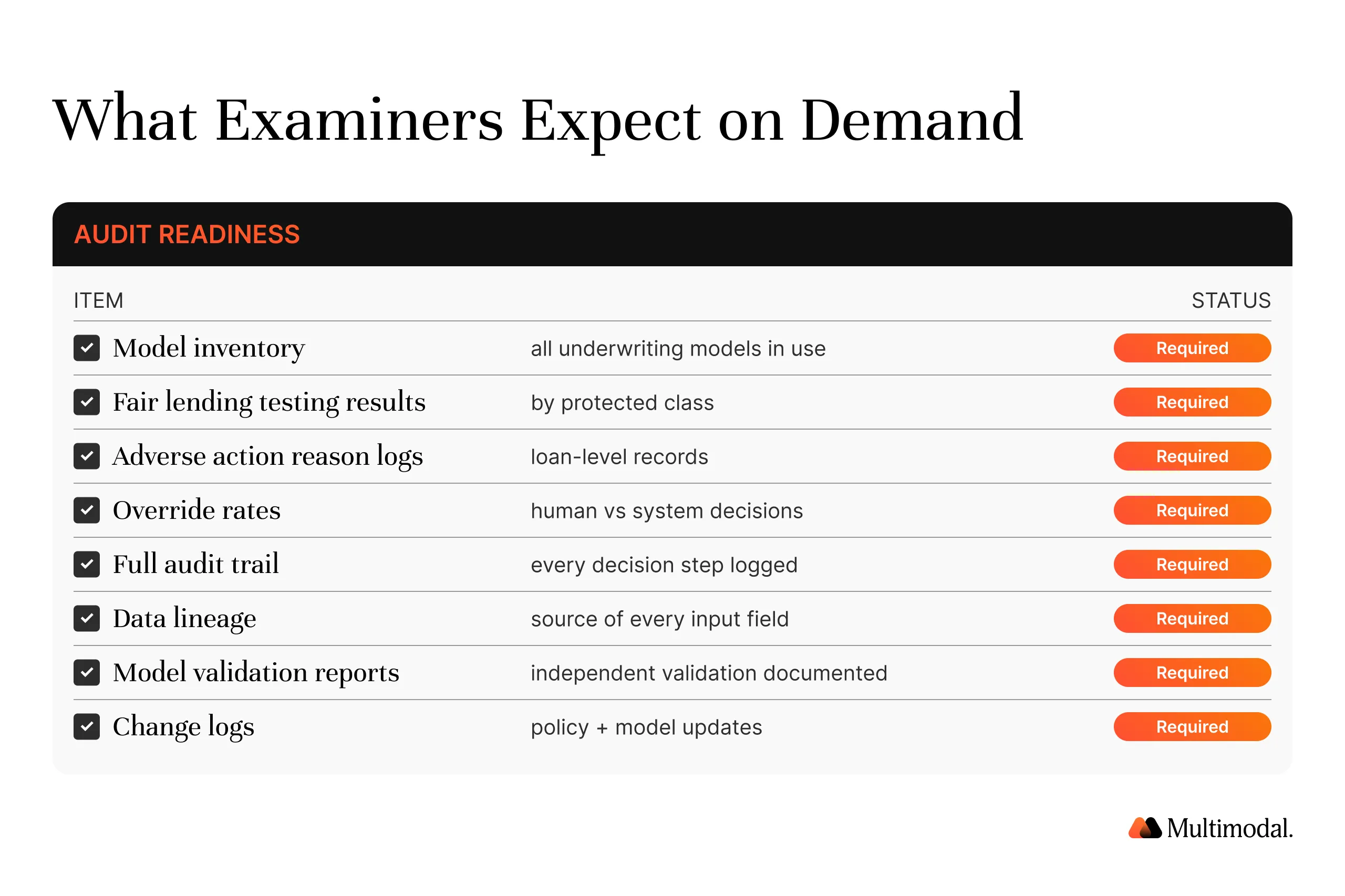 Examiner expectations. Examiners now routinely request underwriting model inventories, fair lending testing evidence, override rates by protected class, and documentation of human review for exceptions. Lenders that cannot produce these artifacts in a single afternoon are flagged for deeper review.