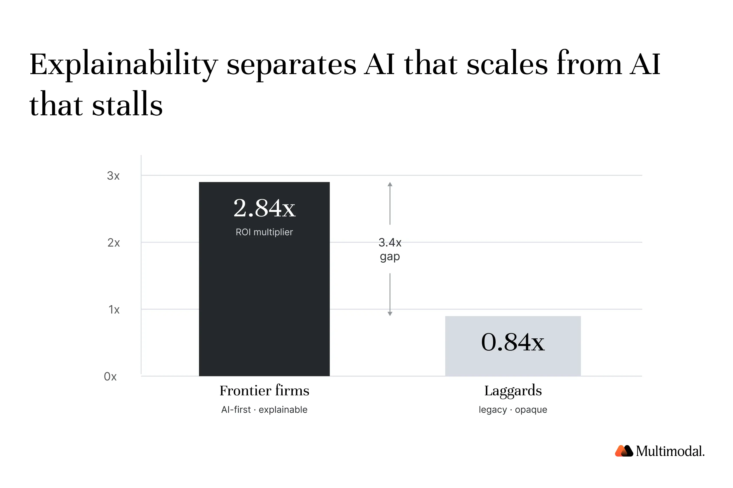 Three data points define the stakes. $89M in enforcement penalties for opaque AI credit decisions. 2.84x returns for frontier AI adopters versus 0.84x for laggards, with the gap widening. And EUR 52,227 in annual compliance costs per model under the EU AI Act, a figure that compounds across every unexplained AI system in your stack.