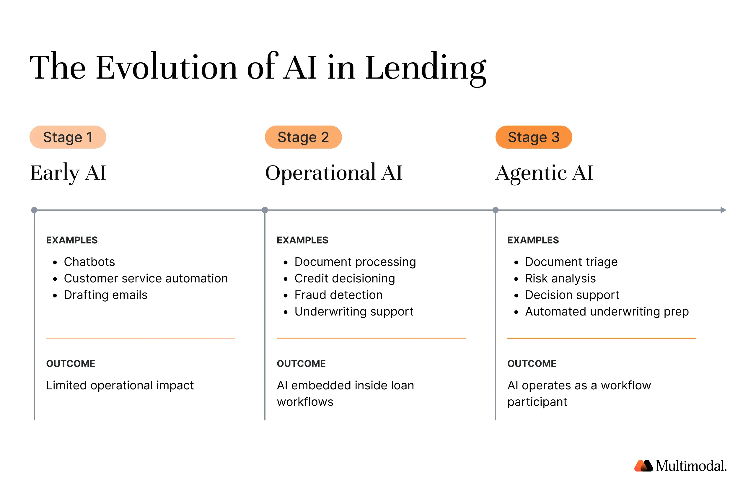 Early AI adoption in financial institutions focused on AI assistants and conversational AI tools. These systems answered routine inquiries or helped loan officers draft communications with borrowers. Useful, but limited in terms of operational impact.