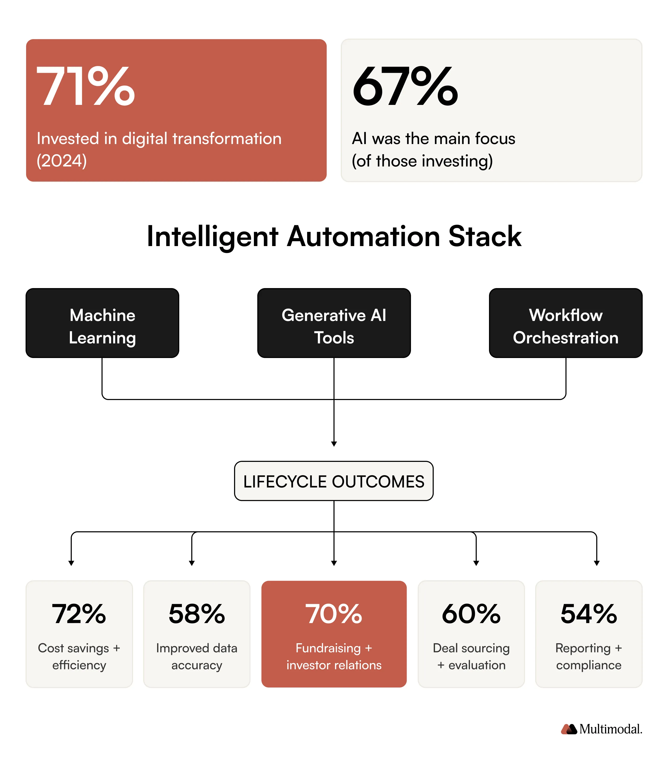 But "in some stage" is the critical phrase. The top expected outcome from digital transformation is cost savings and operational efficiency (72%), followed by improved data precision and accuracy (58%). Fundraising and investor relations is the area firms say they stand to benefit from most (70%), with deal sourcing and evaluation a close second (60%).