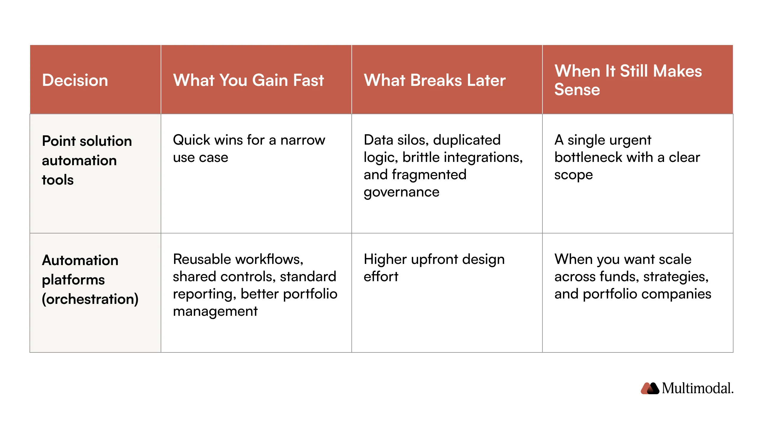 Buying a standalone bot for a single workflow produces local improvements but doesn't fix the system. A related perspective from Panamoure Consulting's intelligent automation report frames the opportunity: when AI capabilities are orchestrated across the value chain, intelligent automation becomes the foundation for an operating model that is more agile, scalable, and transparent, positioning firms to deliver superior outcomes for investors and portfolio companies alike.