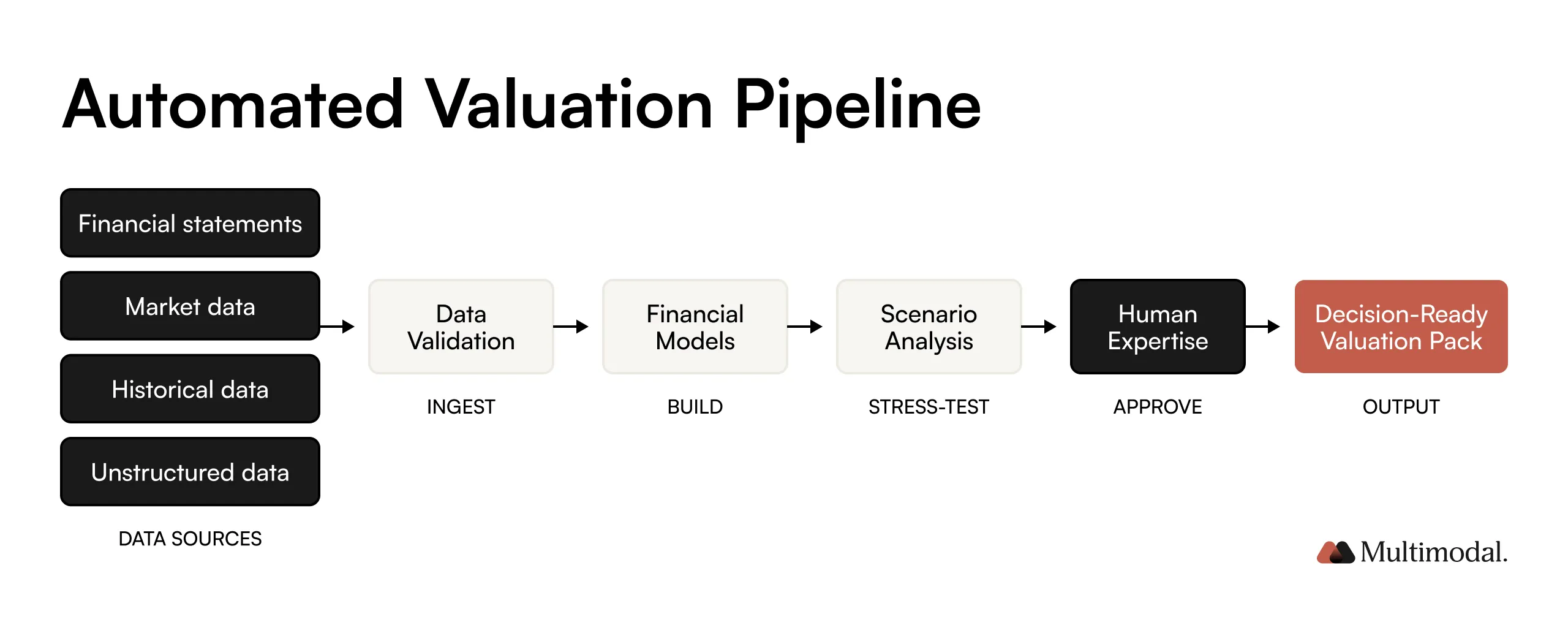 That shift matters because large data volumes are no longer an edge case; they're the norm. Firms winning on valuation work treat it as a data pipeline: automatically ingesting financial data and market data, normalizing and validating inputs, using machine learning models for pattern detection and scenario sensitivity, and keeping human expertise in the loop to validate assumptions and reconcile edge cases.
