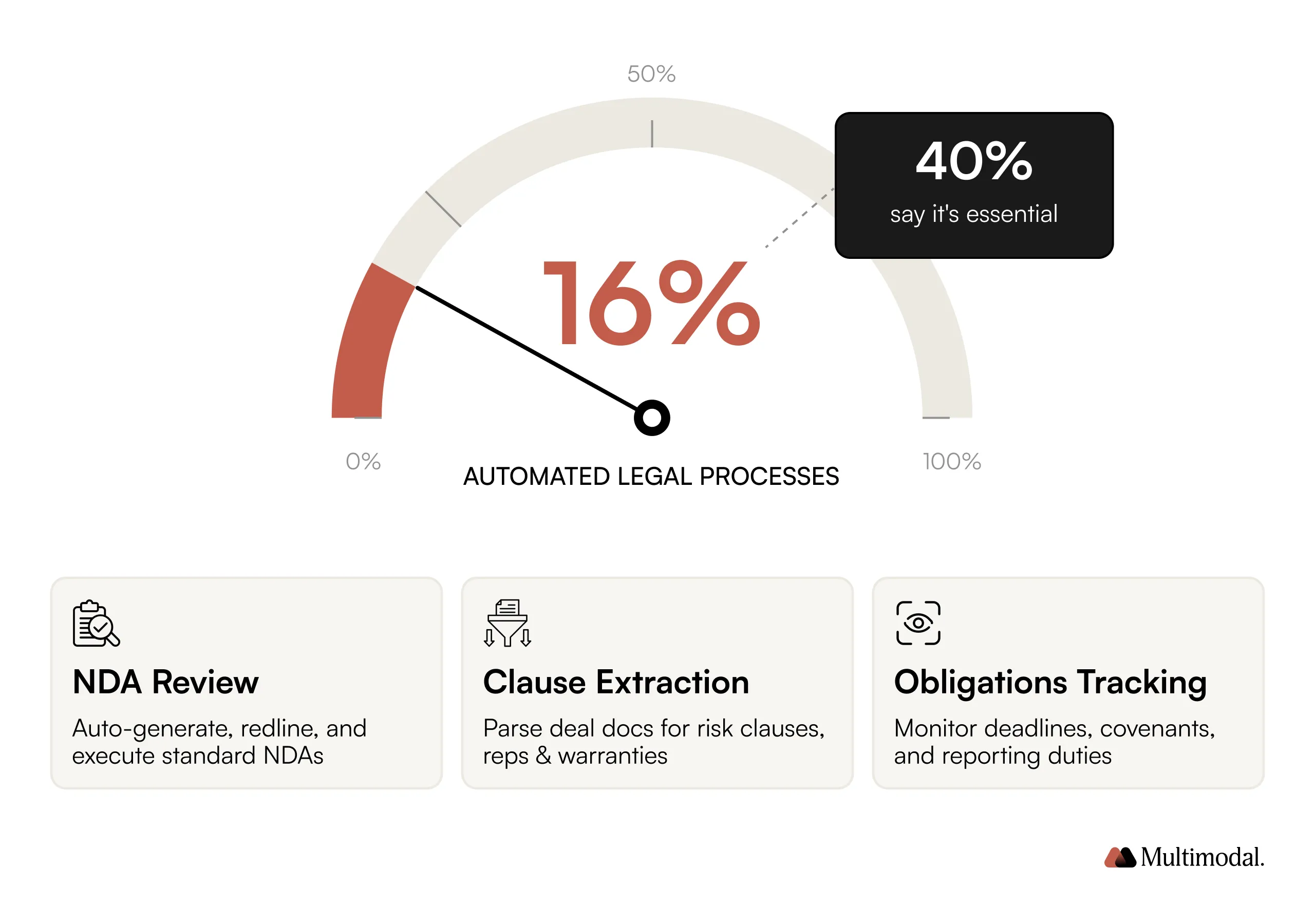 Despite broad momentum toward automation, legal workflows have remained largely untouched. Ontra's digital transformation research reports that while 40% of PE firms consider legal process automation essential for private markets, only 16% have actually adopted it.