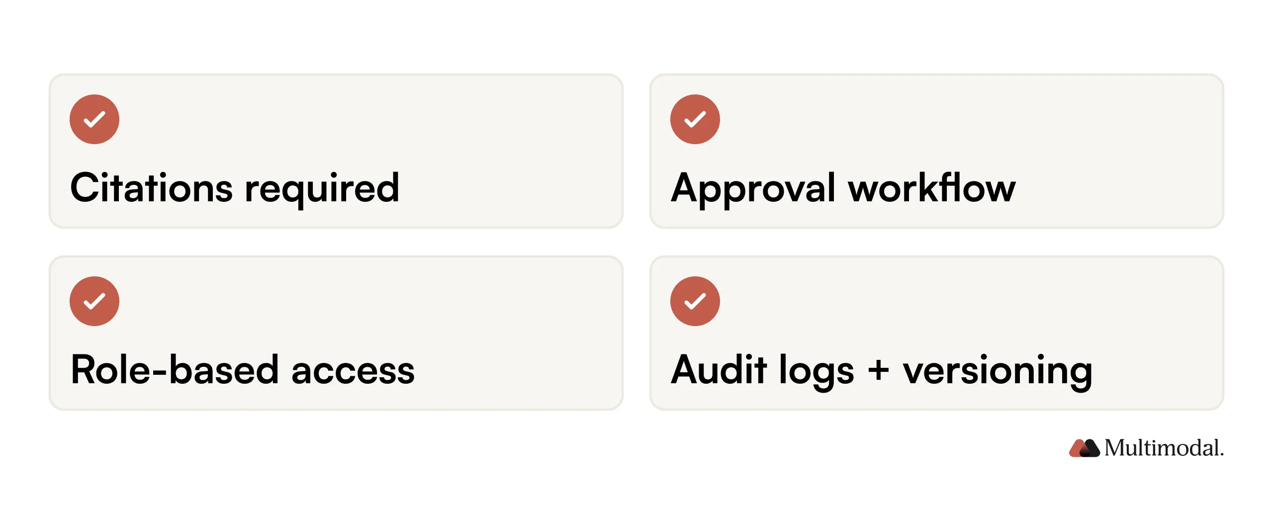 Build compliance and AI governance into the workflow from the start. PE firms need to care about AI governance because automation failures create audit headaches and reputational risk. Robust security measures and governance aren't features to add later; they're structural requirements. That means requiring citations for model outputs that influence investment decisions, logging inputs and human approvals for sensitive steps, using confidence scoring to route low-confidence work to human review, and enforcing role-based access controls to keep data within appropriate boundaries.