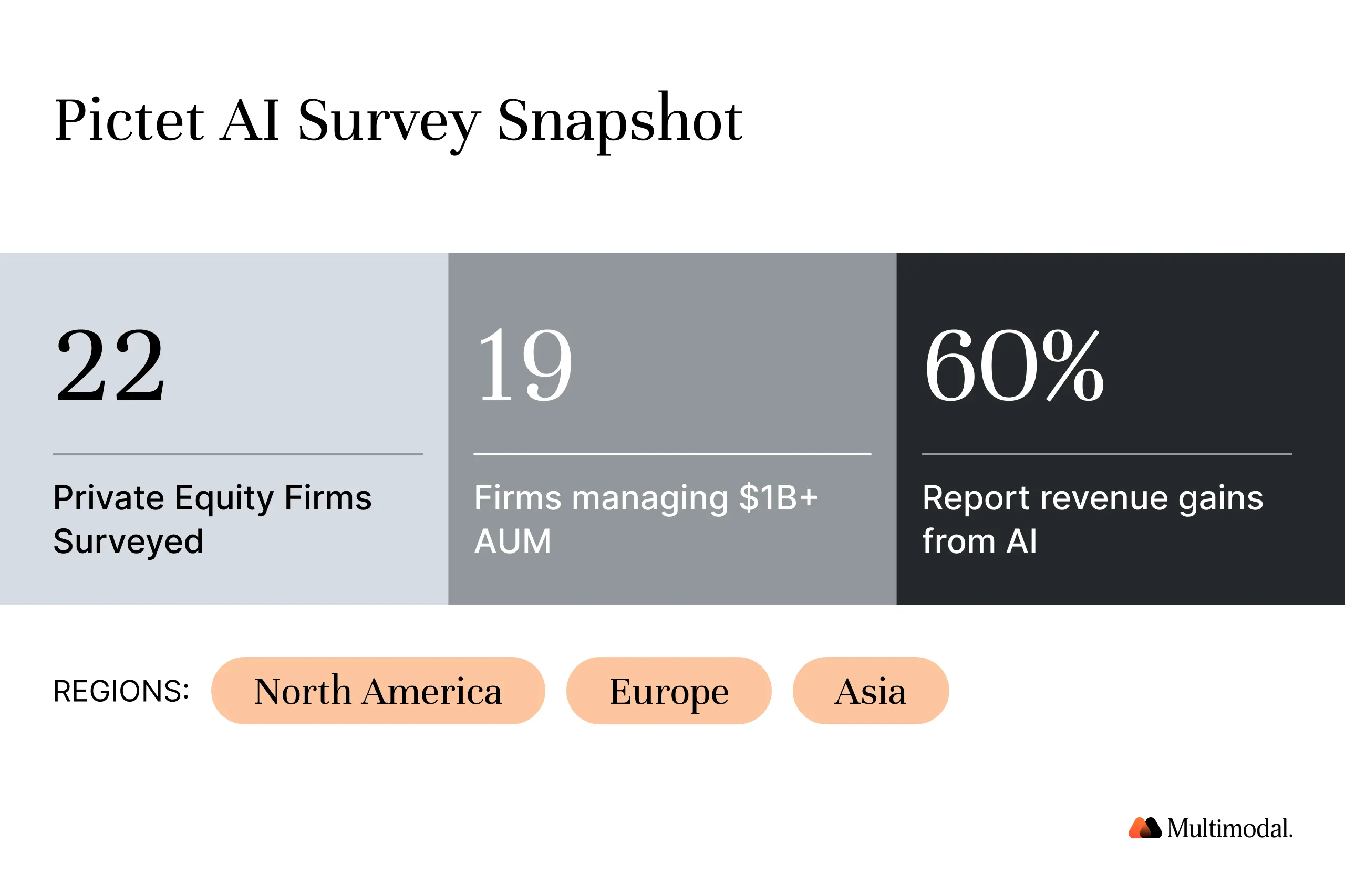 The 60% figure comes from Pictet Alternative Advisors' analysis of AI in private equity. Pictet surveyed GPs at 22 private equity firms in October and November 2024. Of those, 19 managed more than $1 billion in assets, and respondents were spread across North America, Europe, and Asia. Responses to individual questions ranged from 14 to 16 directional, but from a relevant group of sophisticated capital allocators with direct visibility into portfolio company performance and financial data.