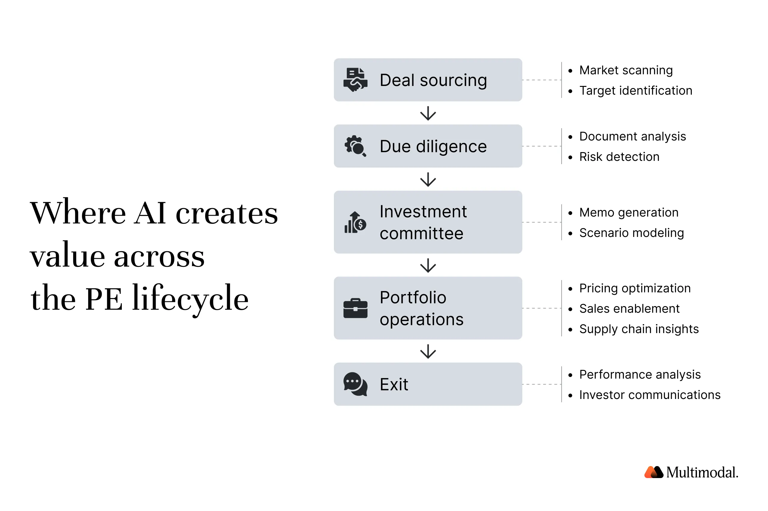 For PE firms evaluating where to focus, PwC identifies the highest-value use cases as deal sourcing, data-room workflows, and investment committee support, all places where speed and accuracy create direct competitive advantage across the investment lifecycle.