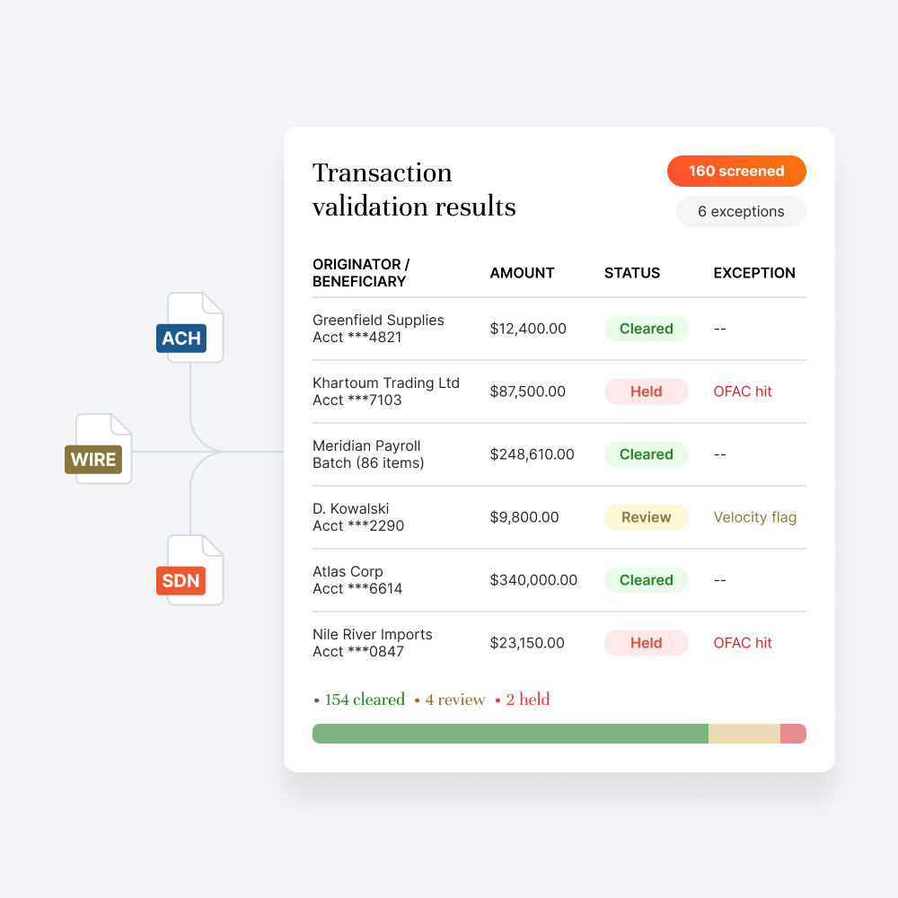 Screen incoming and outgoing ACH and wire transfers against OFAC lists, internal watchlists, and transaction limits. Flag anomalies, validate beneficiary details, and generate audit-ready logs.