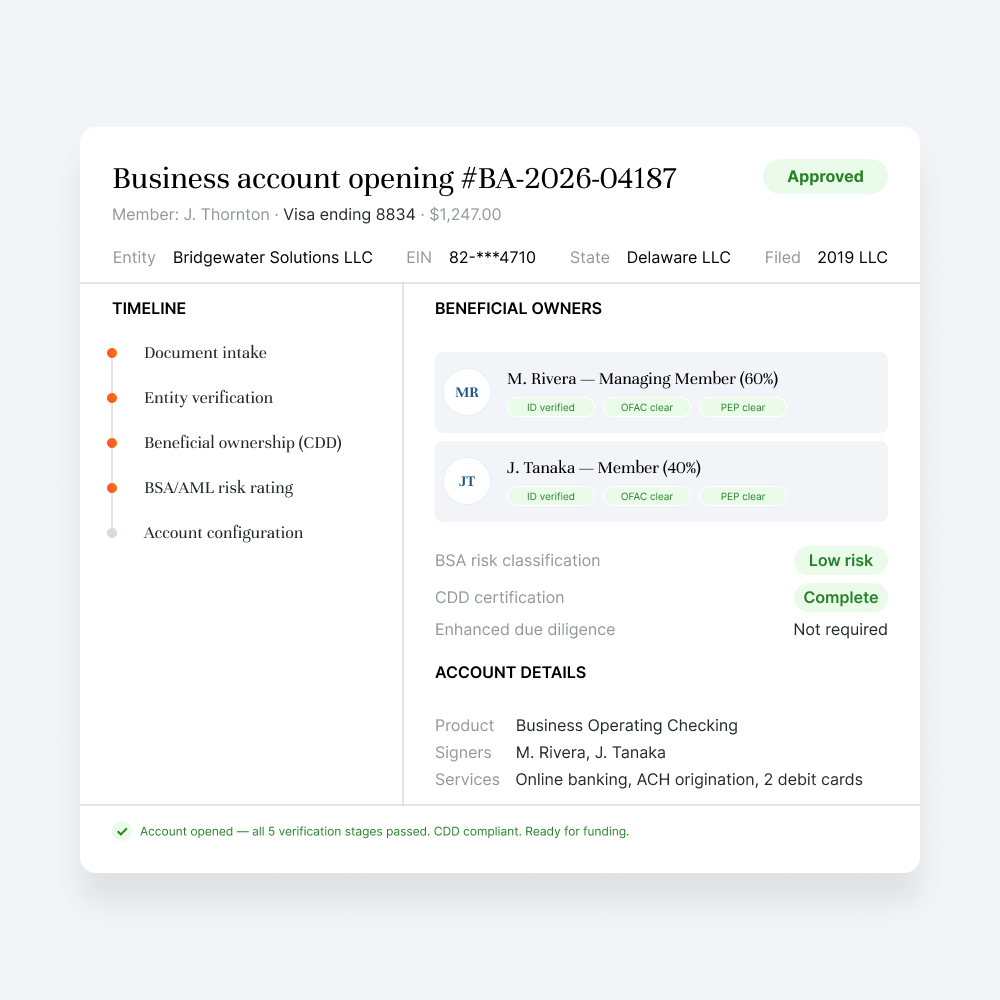 Extract entity data from formation documents, verify beneficial ownership, run KYB screening, and produce a complete account opening package with risk classification and compliance sign-off.