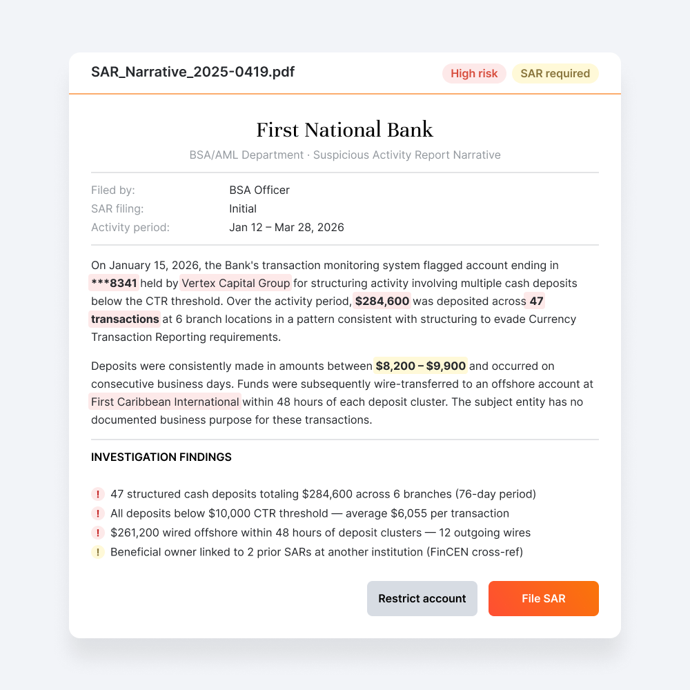 Yes. Every investigation runs inside your institution's governed environment, PII, transaction records, and case documentation stay under your control from intake to closeout, with zero data retention by default.