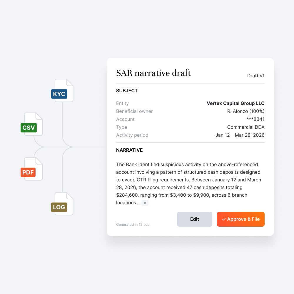 Human review is built into every workflow. Analysts override any output, overrides logged with reason codes and preserved in the audit trail, keeping every file defensible.