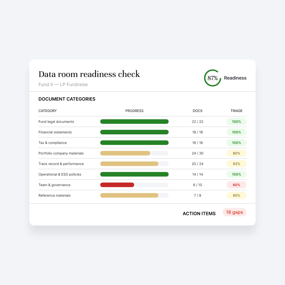 Audit virtual data rooms against your standard checklist. Identify missing documents, flag incomplete filings, verify version currency, and generate a readiness scorecard with gap analysis.