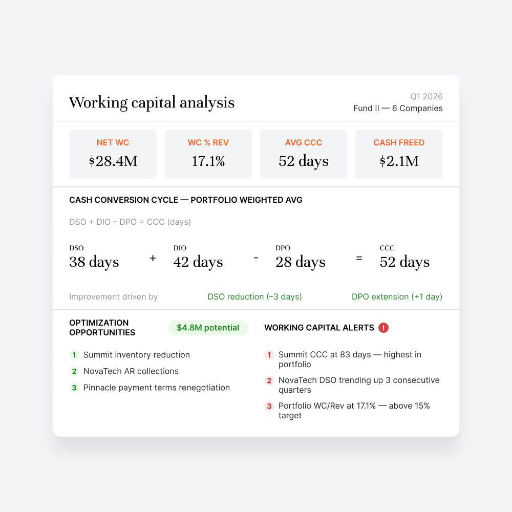 Extract AR, AP, and inventory data from financial statements and trial balances. Calculate DSO, DPO, and DIO trends, model cash conversion cycles, and produce working capital reports with commentary.