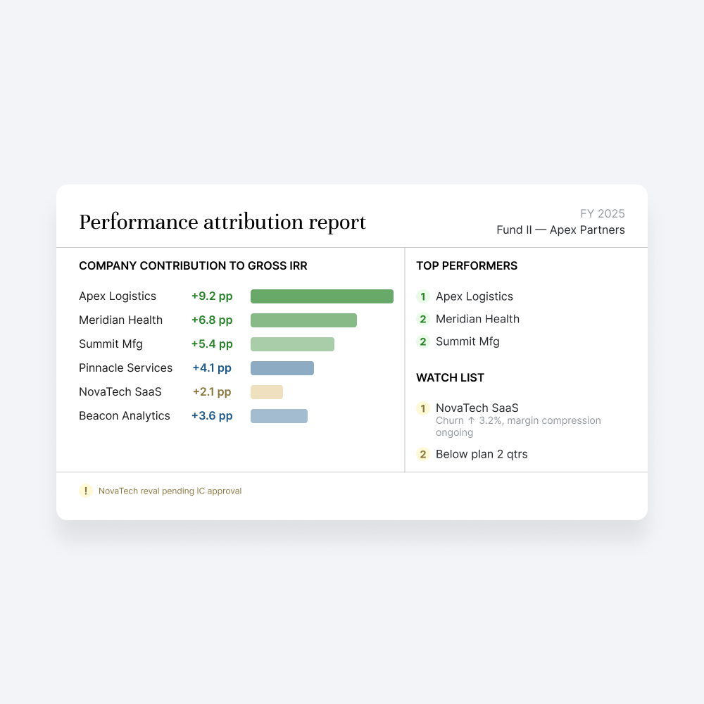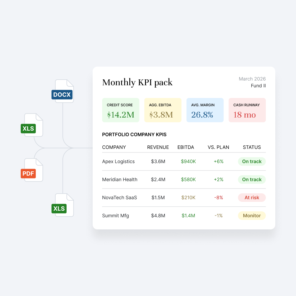 Yes. Pre-built fund ops workflows cover the full post-close cycle, quarterly LP updates, monthly KPI packs, covenant monitoring, and board deck preparation, all running to the same standard every cycle.