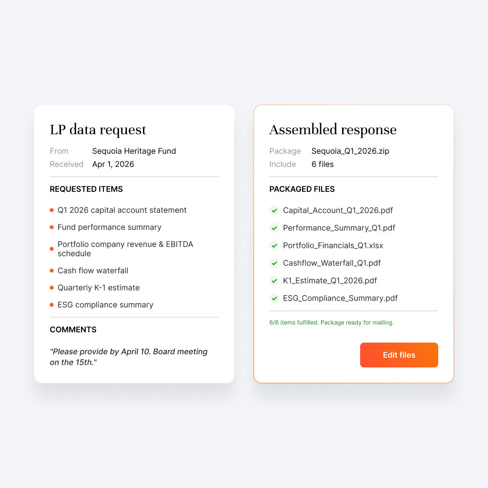 LP questions matched to your fund documents, responses drafted, and a complete package produced, your investor relations team reviews and sends, instead of searching and writing from scratch.